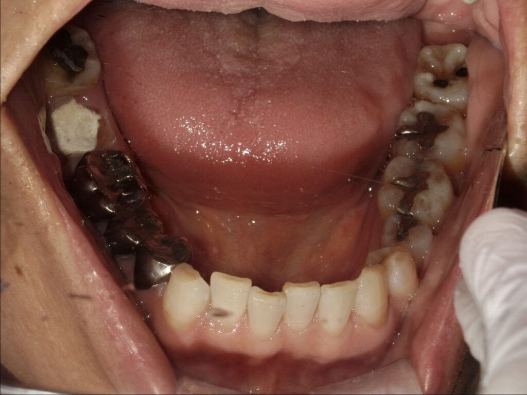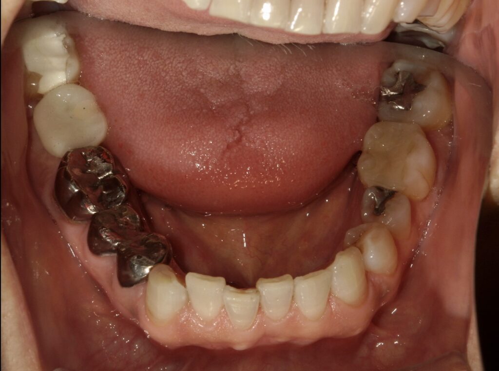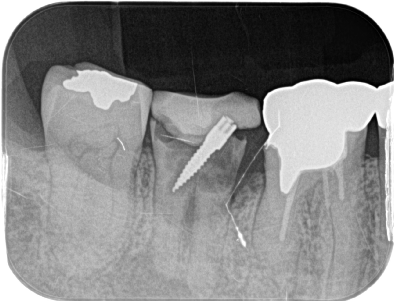 治療内容 | スクリューポスト不適合で、根尖病巣も大きく残すことが難しいため抜歯しインプラント治療へ。 歯槽骨の量が不足している場合に、人工骨や自家骨を移植し、特殊な膜で覆うことで骨の再生を促し、インプラントを埋入できるようにするGBRという治療法も併用。 |