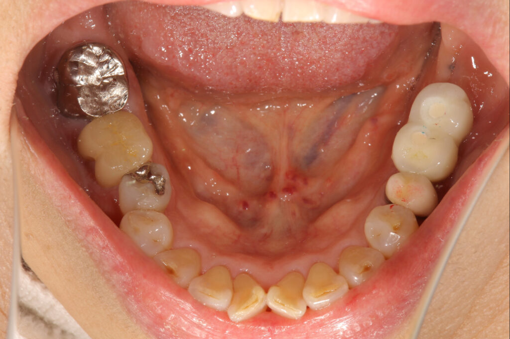 治療内容 | 根尖病巣で排膿もあり残すことが難しいため抜歯しインプラント治療へ。 歯槽骨の量が不足している場合に、人工骨や自家骨を移植し、特殊な膜で覆うことで骨の再生を促し、インプラントを埋入できるようにするGBRという治療法も併用。 最終的なかぶせものはご自身の歯と変わらないような仕上がりとなっています。 |